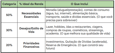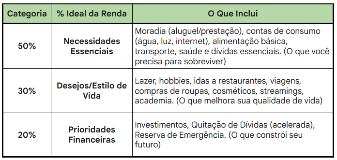 Criado pela Senadora americana Elizabeth Warren, este é o modelo ideal para iniciantes e para quem busca flexibilidade sem abrir mão do controle. É uma divisão prática da sua renda líquida: